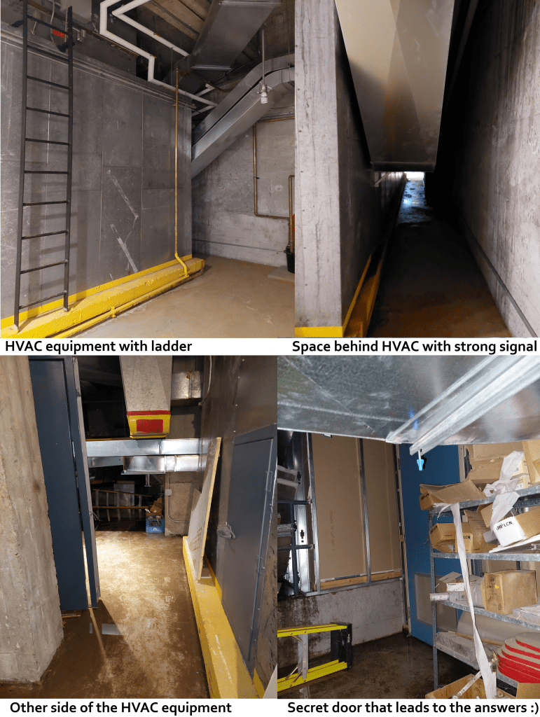 Although it does not exist on any map, the mechanical room is an enormous, underground, concrete space covering the areas shown in green above. When I walked towards the very back wall the signal strength started to increase until I found myself in a two-foot-wide space between a large piece of HVAC equipment and a concrete wall. The Ducting from upstairs ran here and then turned and went through the concrete wall. The signal was rapidly jumping between -32 and -21 all while I was standing still. Since none of this exists on any floor plans, I could never find what was on the other side of that wall. I climbed the ladder on the HVAC equipment to check for monitoring device that may have been incorrectly setup but found nothing. I climbed under some very low ductwork and found a door on the other side which seemed to lead to a space behind the wall where ducting disappeared.