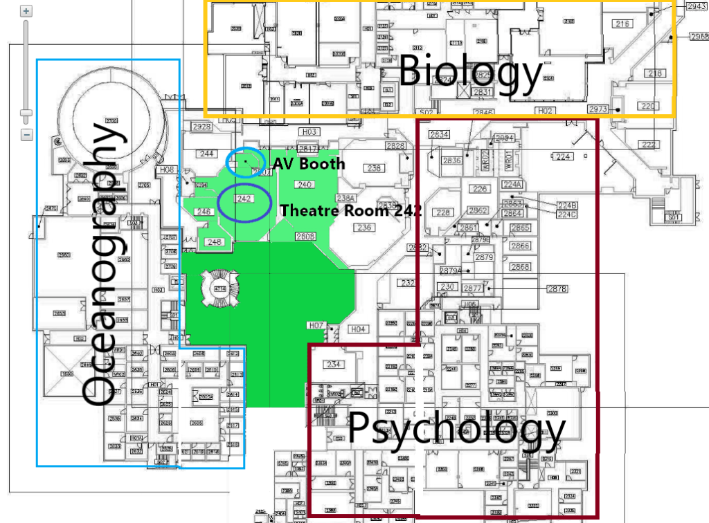 The area where I noticed the D-Link consists of 4 large lecture theatres; each theatre is concrete floor to ceiling and slopes to cover 2 levels. I was able to find the strongest signal at the top of room 242. Behind me was an AV booth behind its own concrete wall, so I called security for access. The signal was the same as outside the booth. As you can see on the map, this building is attached in a cluster with 3 other buildings. After spending some time trying to trace the signal and finding it in various other spaces in these buildings, sometimes hitting -52 to -48 to give me hope I was going in the right direction, I went back to the place where I could hear the SSID the strongest, and as I looked up, I noticed there was a large HVAC duct right above me. Since I was at the back of the theatre, I could touch it with the etherscope (so I did). The signal got stronger. I did a bit of googling and found a few articles and studies where people used ductwork as a conduit for radio. I knew the main mechanical and heating space was partially under this theatre, so I went that way.