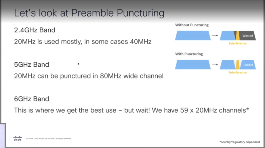 The basic example of preamble puncturing is (see pic in slide below) if you were using an 80MHz channel and one of it’s 20MHz channel has a DFS hit/interference, it will just remove that 20MHz channel from the equation and continue with the rest of the channel width without having to change channels or drop to say a 40MHz channel. Super cool feature and probably most valuable in 5GHz because you a) should only be using 20MHz channels in 2.4GHz , and b) there’s not a lot of known interference or DFS channels in the 6GHz band at this time.