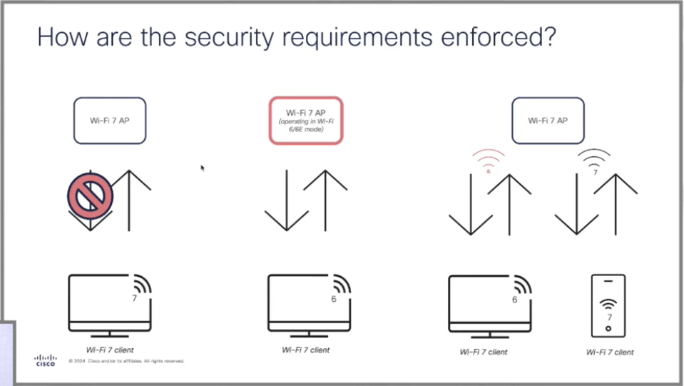 The middle option above shows a situation where you would choose to lower the Wi-Fi 7 AP to 802.11ax because of client capabilities or if you are not ready to implement things like OWE or WPA3. It shows that the downgrade is set by admins and not dynamic based on client capabilities. Lower capable client cannot cause APs to downgrade. So, if needed the Wi-Fi 7 APs can be run as 802.11ax.